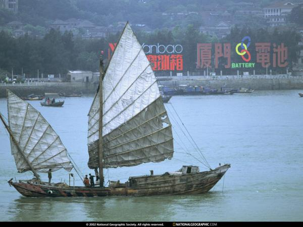 []1992年《国家地理杂志》,行驶在厦鼓海峡的木帆船,图片来源于网络.