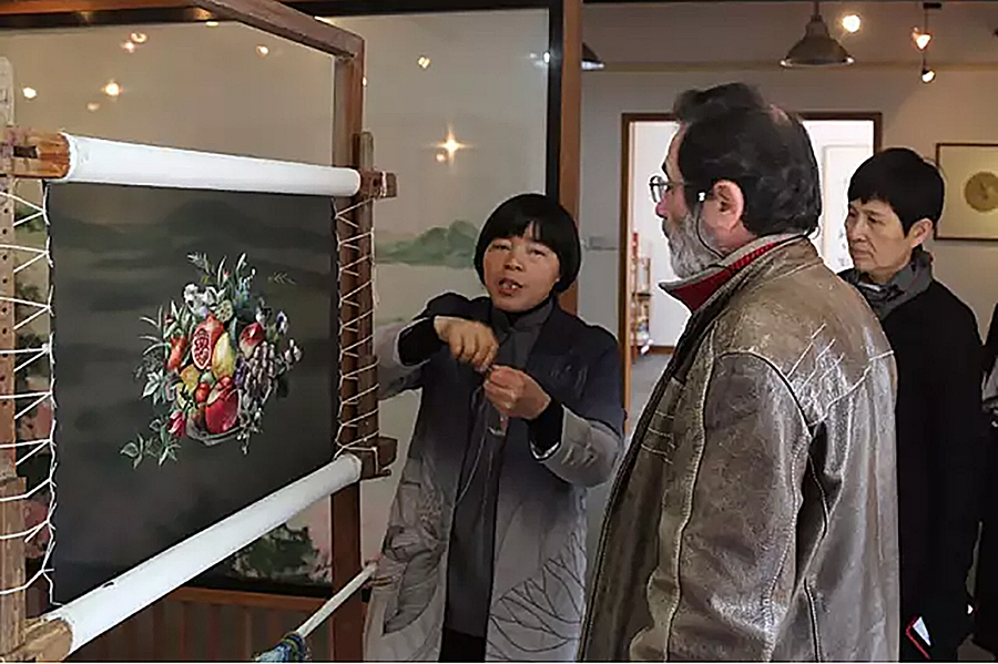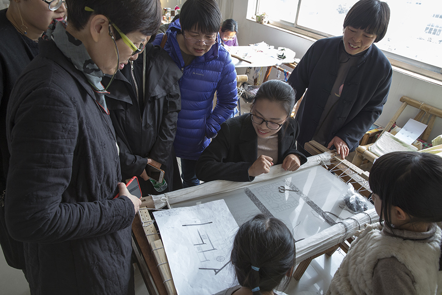 同日,纤维艺术系教师参观梁雪芳老师绣坊