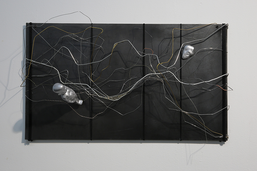这件作品对于我来说是一种蜕变,但同时依然是对于人的关注。呓语中的情态物化成型感赋予,孩子的突兀打破图面的单一性,即是生命的冲突,也是符号性的隐喻,更是坦然的状态。线条犹如迷宫、电流、印记,翻滚涌动,忽大忽小,强悍而又细小,厚重且难以平复……编织的线分割占据着空间,也是场域权利的互动,关系中的平衡偎依在一起时才会体现出某种秩序。作品中的线和物像也在冲突和互补中权衡着彼此之间的范围。