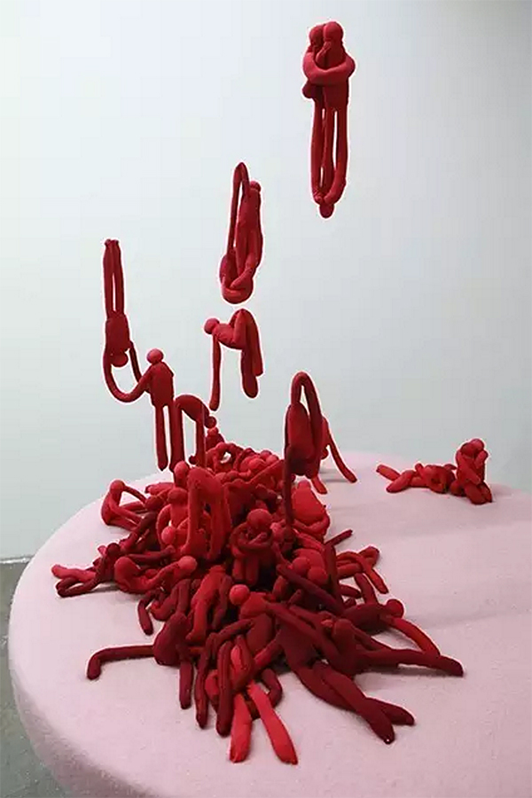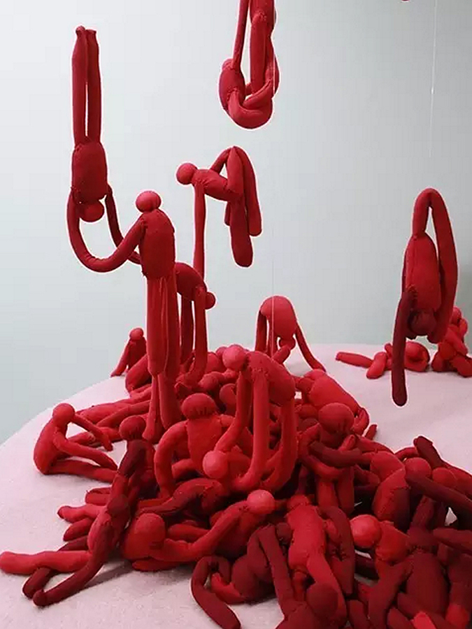 《孟子·尽心上》曰:“万物皆备于我矣。”万事万物都为我所具备。“涌”,似是思绪的翻滚,人性的思忖;红色,又喻为生命的绽放。不同的小人相互缠绕、叠堆、悬挂,揭示了自己的不同状态,意为自己心中涌现的我,时而怡悦、时而惆怅、时而结群、时而寂寥,是思索的,亦或是善变的。