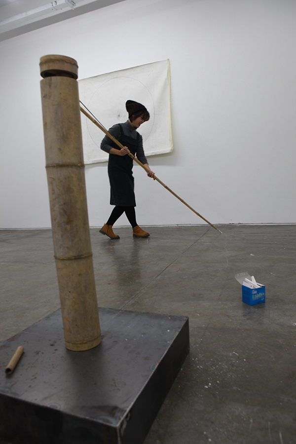 游戏这一系列互动装置来源于一段时间的气功练习,在气功练习中找到自身身体的存在感。弹力绳是一种控制身体的媒介,借助于一条绳子的束缚有利于更好的感知身体的动作,进而完成一系列的任务。类似的运动很多——跳绳,跳皮筋,翻手绳等等,都是通过一个工具通达身体,达到一种平衡。弹力绳由于自身的弹力创造了一种不稳定感,而气功中的重要法门在于气的运用,绳索自动成为一种游戏的规则,也是一种障碍,游戏的完美实现没有什么秘密技巧,只有反复的练习。