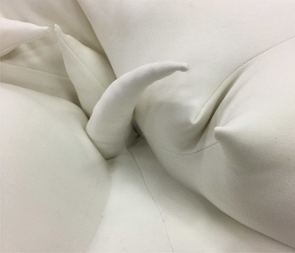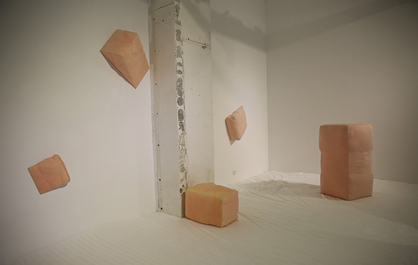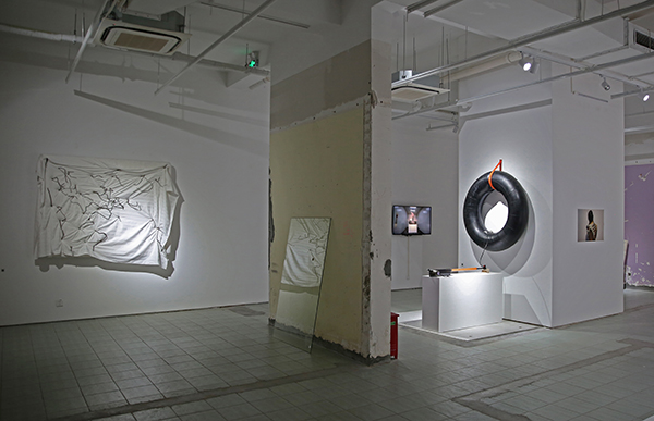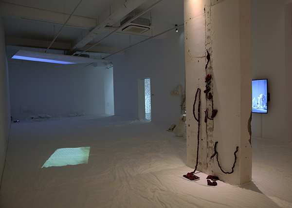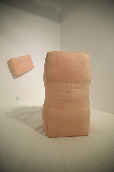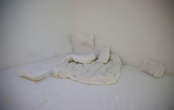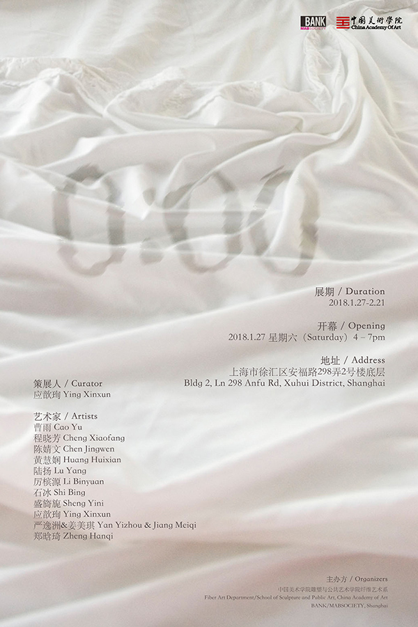 纤维和身体,是最为日常和理所当然的关系,这种当然性形成了一种常态,但是当我们看到熟悉的日常有些错位时,那种熟悉的陌生感就产生了一种能量的转化,在脱离标准化的可能性中形成无限的可能,新的状态在“非常”中生成。在此次“0:00”的展览中,地面被做成巨大的柔软的床,人们可以在展厅白色床单中躺卧,私人卧室与公共空间相混淆,观者以“日常”的个人化的“0:00”时分的身体状态,在不合时宜的场所中触发一种超出经验的身体体验,此时“日常”成为了“非常”。当我们无法形容一件事物超出了某种范围所处的状态时,通常会用“非常”这个词来表达,蕴含着对立于“正常”的战争以及对于“僵化”的处理与自由的创造,在“似是而非”的体验中,新的感知生发于其中,在这种极端的临界状态下,事物处于发生质变的临界点上,或者已然开始了改变。