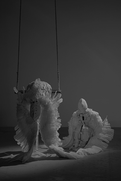 Video, installation art, performance art 身体装置表演,影像,摄影 Mental patient retrains clothes, feathers, swings 精神病人束缚衣,羽毛,秋千 Dimension variable 尺寸可变