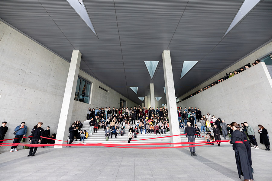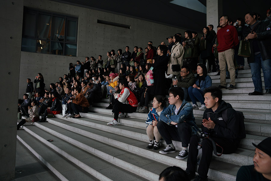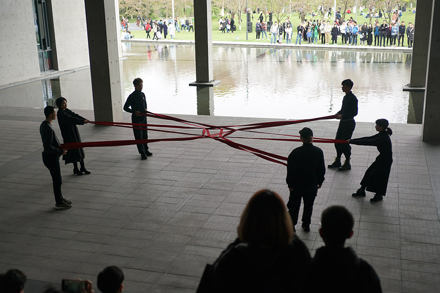 开幕式告一段落后,现场嘉宾移步至良渚文化艺术中心大台阶观看由艺术家石冰及其团队带来的群体行为艺术表演。