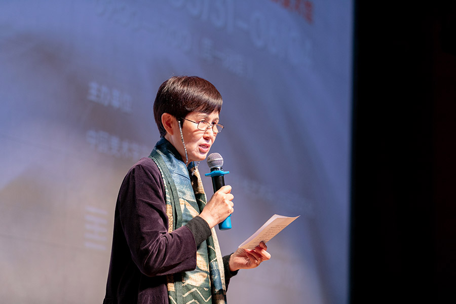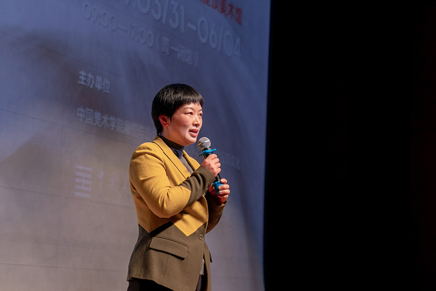 ▲中国美术学院纤维艺术系教授、本次展览的学术主持施慧现场致辞