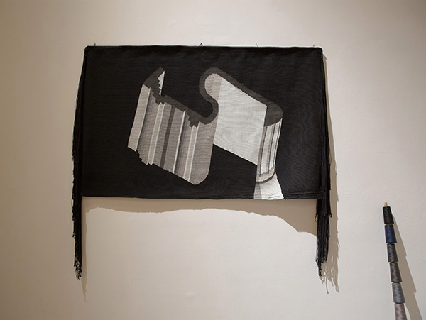 作品简介:该作品中的壁挂为在空间中展开的罗马柱,利用平针编织的手法及线的颜色将其表现,由线成面,再由面展示空间和体的关系,该平面中的空间又与由线轴组成的柱体相连互应,形成二维与三维,柱体与柱体之间的联系。平面空间的内容是随意的,往往能做到在日常生活的空间很难达到甚至无法完成的事物,而平面空间也无法达到三维空间所带给我们的真实感,就像这两个柱子,壁挂中的柱子夸张抽象,旁边的柱子由线轴组成的柱子平淡却真实。人与人之间性格样貌也不一,却构成了和谐的社会。空间与空间之间虽不尽相同。