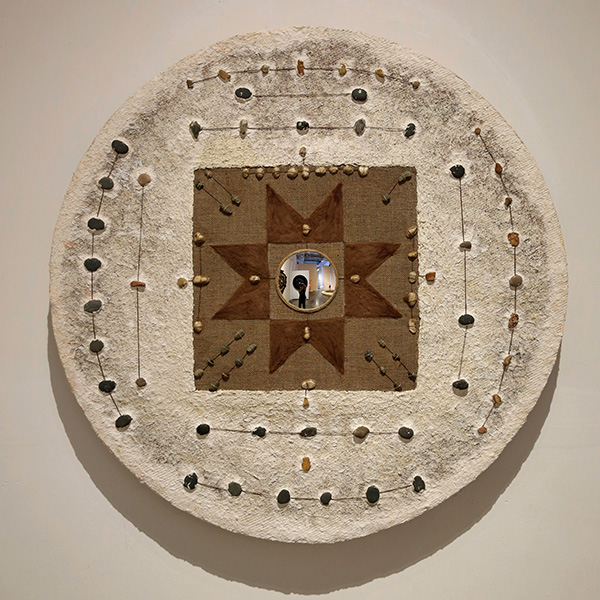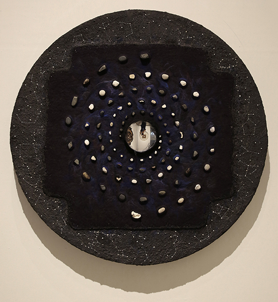 作品简介:“仰观垂象”系列作品的灵感来自中国人的传统时空观念,以宇宙星象、洛书河图、天圆地方说为主题,抽离出其中独特的造型元素,组合而成。星河图中包含着旋转纹样的河图,深浅两色的石头排列出河图的基本造型,周围环绕着中国传统四大星象中的二十八星宿,透露着宇宙的无限和神秘的气息。中心的凹形镜面将现实景象收入作品之中,在天圆地方的造型中压缩了天地宇宙。