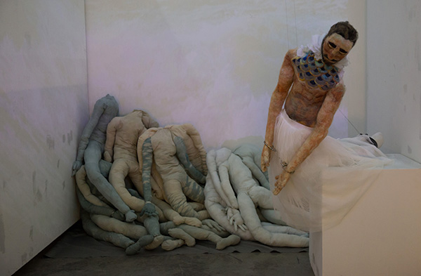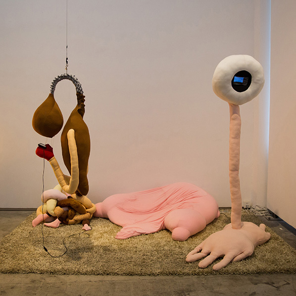 现在强暴事件频发,妇女拐卖泛滥;部分女性被强行作为欲望和生殖任务的承受者,如同暴力控制下的两脚牲畜。 我用海绵、棉花、羊羔毛绒布来制作我的维纳斯,并将她的腿变形,更像是羊蹄子。除了腿部支撑,身上没有一根钢筋。