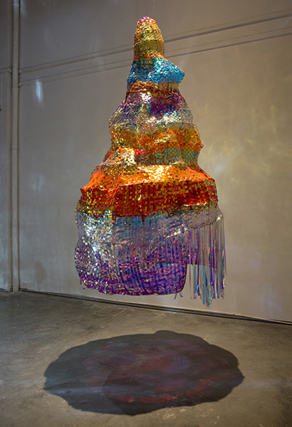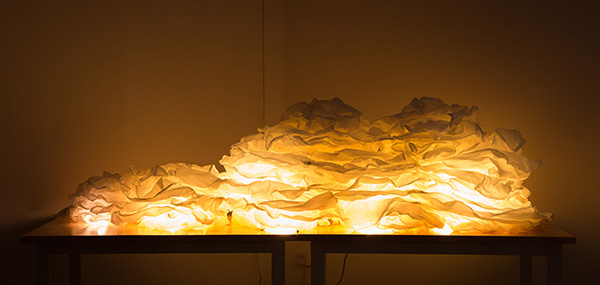 作品简介:一次无意中发现烟在光源照射下像极了会动的不规则雲朵,参考了中国传统祥云的造型,利用纤维软雕塑的随机性与可塑性捏出“雲”的不规则形状,借鉴“灯光艺术”多点光源的表现手法来丰富视觉效果和探究纤维软雕塑语言中与其他媒介转换的可能。