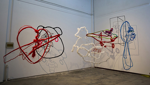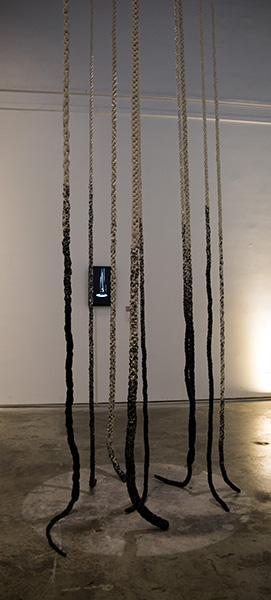 作品简介:我把自己比喻成一方墨,去不断地浸染白色的棉绳,借用刺绣的方式把经文绣在绳子上,在不借助登高工具的情况下,绣到直到不能再往上的高度。当你把棉线放进墨池,墨水的密度、环境的温度、棉线的材质都会影响到墨水上升的高度。