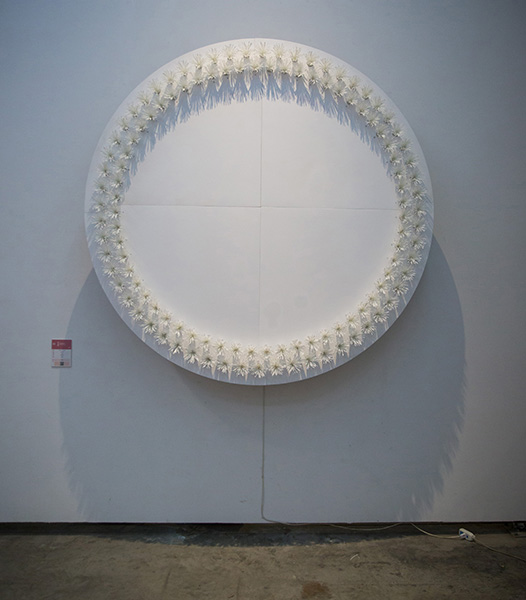 作品简介:圆形面板上的白色软管旋转摩擦制造出一种有序的重叠的声音,音源在整个空间呈中环状变速流动状。发声声源的同类堆积产生一种情境感和场域性。共振之上,人的感知被解构,与场域的氛围融为一体。空间,时间,声音,图像汇集为一个以身体直接感知的场。