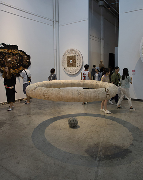 作品简介:我的作品有三层含义。其一,无名,万物之始,空可生万物。道家的空之境界随玄妙但我却有自己的理解。虽然无法使万物成空但是我却可以通过不断的重复的编织使得自我进入空灵之境,从而体会“空”。此外,我也想通过数以万计的不断重复的动作来阐释我对时间的思考,每一次编织都是自我对时间的从新定义。因此作品本身就成为了某一时间段的我本身,即那时的我或者我的那时。最后通过作品的展示使我和道以及环境产生关系,来改变那时的我或者我的那时。在我看来这样的过程就使得我和时间都产生了无穷变化,变亦不变,不变亦变。妙哉妙哉!