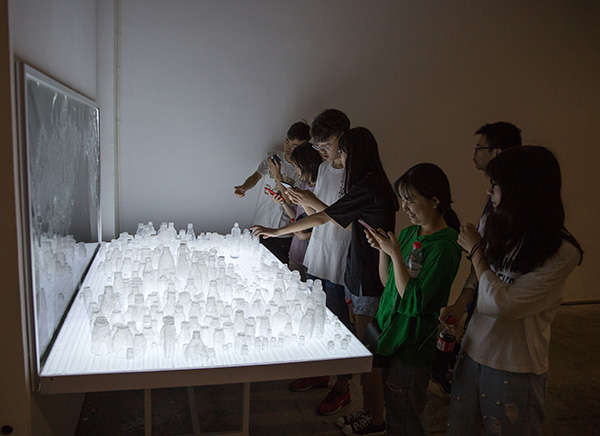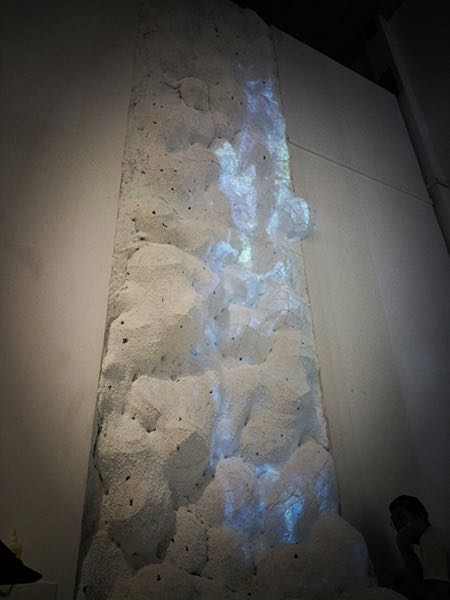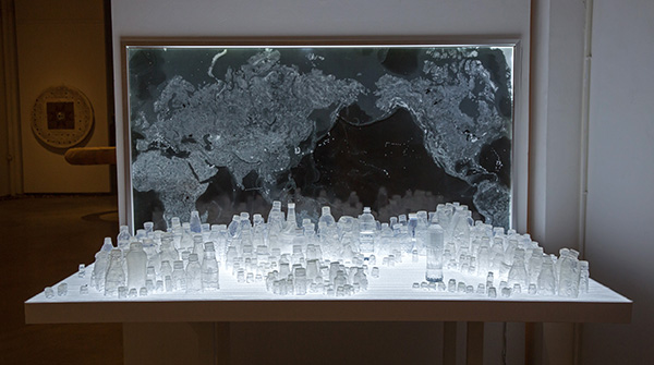 墙上是塑料垃圾在全球的分布地图,硅制瓶依照地图的形状和地形摆放。我使用看X光片的灯箱以及疑似手术台的场景,来等待人为的去处理塑料垃圾。硅胶上的气泡模拟了水翻腾的前兆,预示海啸的蓄势待发。
