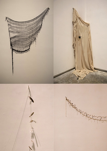 作品简介:结绳如何才能记事,借用这种表达方式来营造一首歌空间诗。这并不是还原古法,而是转译用于表达思想。羽毛代表迅速,骨头代表坚强,绳子的打结方法除了用于计数,还用于记录语言和记忆,等着我们去揭开物质和语言之间的关系。