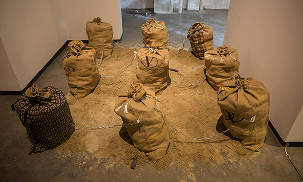 作品简介:在快节奏的现代生活里,每个人都在追求着什么,而奢侈品则成为了许多年轻人甚至是学生们的目标。在我的创作中我在最普通的麻袋上绣上了名牌的logo,麻袋里却填充的是垃圾——奢侈品真的有让我们的生活变得更丰富多彩,还是只是让我们自己金玉其外,败絮其中。我将这些麻袋摆放成九宫格的样子,每一个都立在地上好像从地里长出来的似的,这些麻袋之间以铁链相连,就像墓地上的墓碑——人们将大把的金钱和时间献给它们,它们回报你某个你梦寐以求的奢侈品。