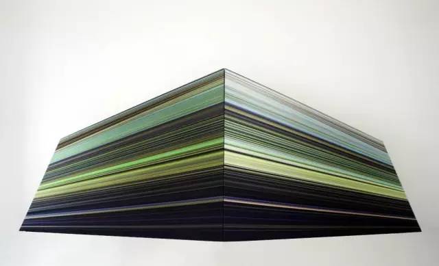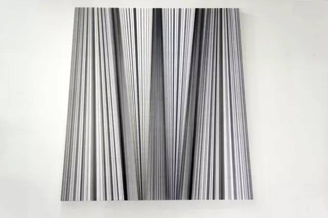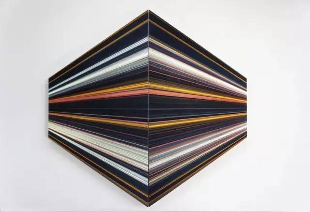 黄燕,《数据》,线,122 x 290cm,©和维画廊 纤维材料良好的延展性使得黄燕能运用到线的拉伸特质,并将其与变化的几何形结合在一起,通过紧绷的尼龙线,呈现出奇妙的视觉效果,给观众带来速度和方向的体验,而色彩的控制又为作品提供了空间,最终在二维的画面上呈现出了三维的效果。 在色彩的选择方面,黄燕的灵感来源于对生活片段的印象和直觉。她关注的是色彩所暗示的空间,同时,艺术家希望借助视错效应,以最抽象、最直接的方式来展现都市生活。