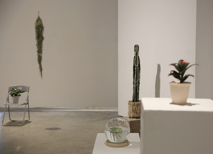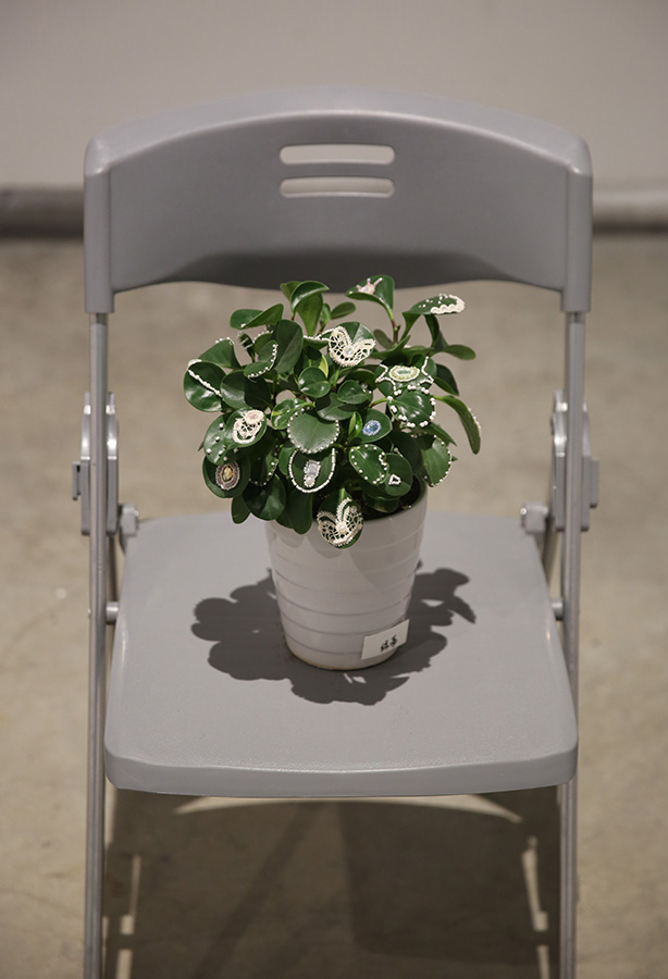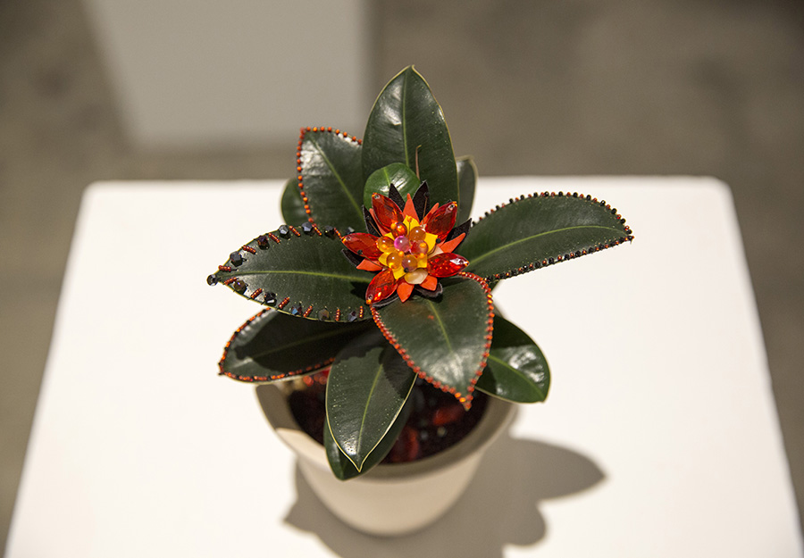 在鲜活的花木上进行钉珠、刺绣、悬挂等装饰, 在保持其依然存活的基础上,根据植株自身的造型特点,以我主观的审美进行改造装饰。 她们性格迥异, 有些清新恬美,有些明媚艳丽。我像装扮一只洋娃娃一样为她们打扮,并为每一棵植物赋予新的名字。