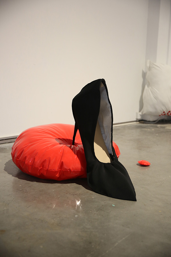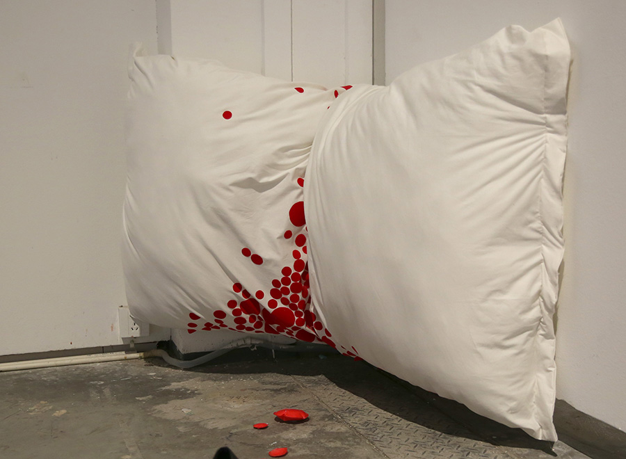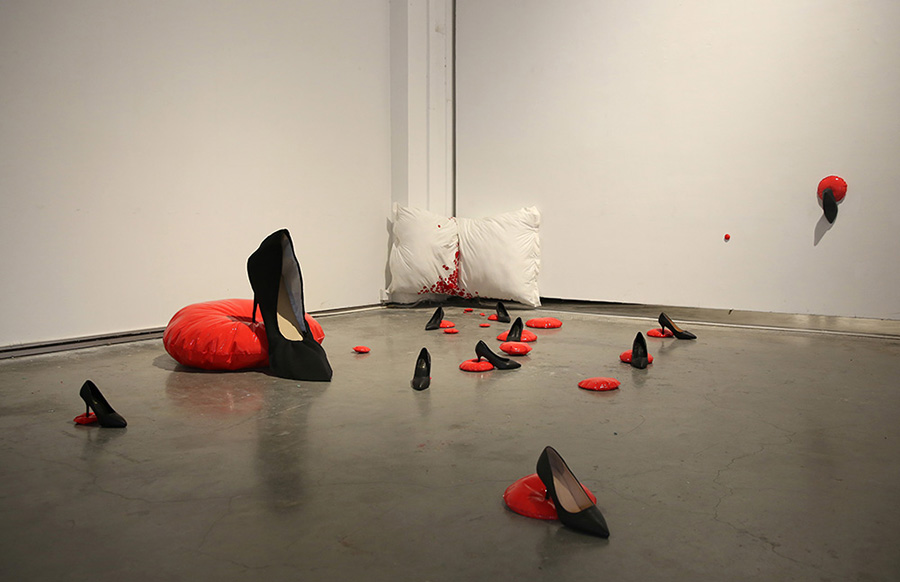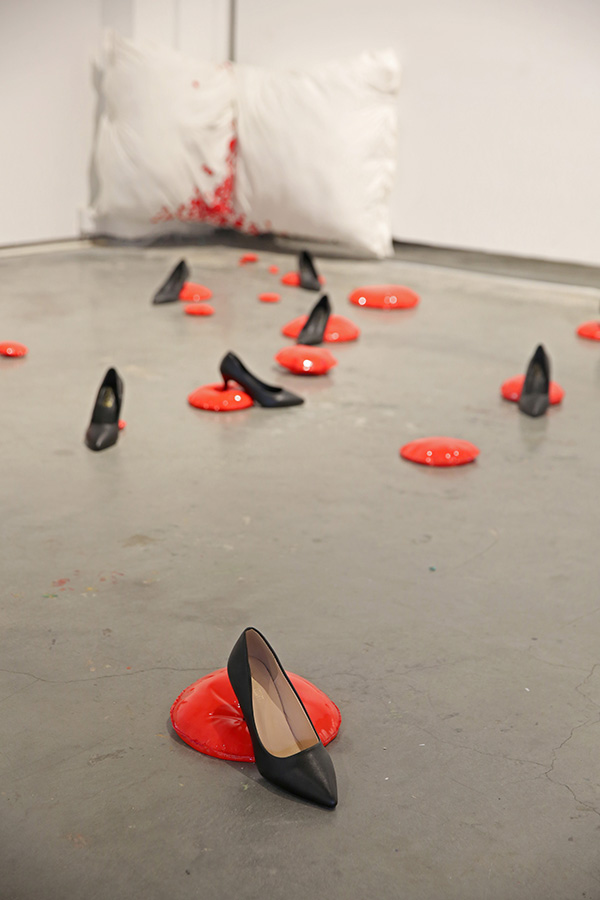 作为社会中的个体之一,每天都会接触到大量的讯息,但其中只有一小部分与自己有关,可是贴心的手机上接连不断的红色圆点却会提醒着我们去不断接收。 在这件作品中我将“红色圆点”这一符号提炼出。被大量的红色圆点包围着的生活,充满了新鲜的资讯,我们甚至可能因此不分昼夜地刷着手机,然而其在带给我们娱乐与新讯息的同时,似乎也为我们带来了源源不断的焦虑。高跟鞋在这件作品中是一个女性的身份与反抗的隐喻,通过鞋跟对圆点的挤压,似乎我们将其击垮了,焦虑也得到了缓解。然而,问题解决了吗?我们到底该如何消解我们的焦虑?