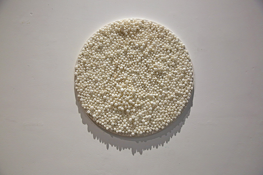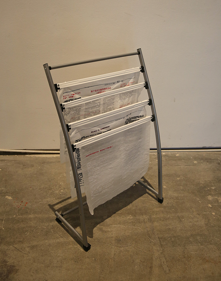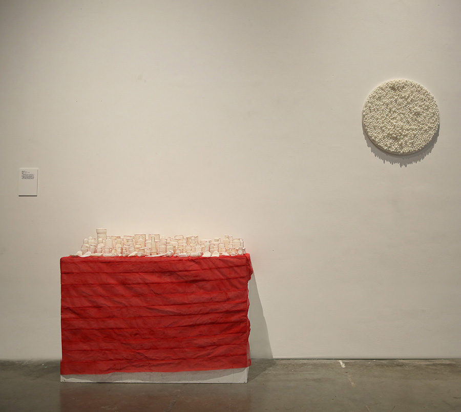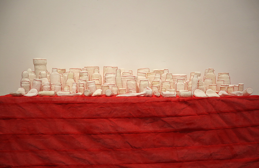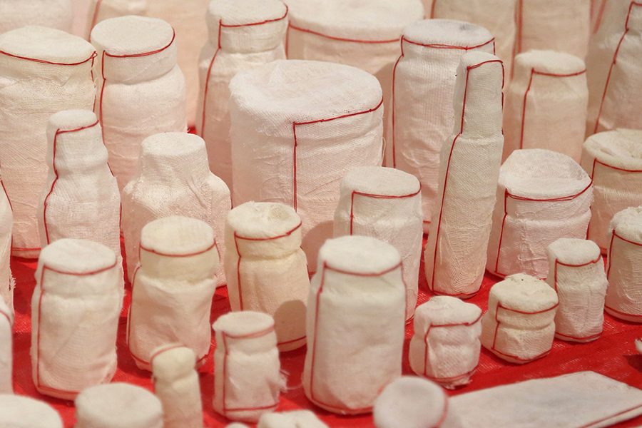 作品的思考来源于当下社会中由于多种压力使人产生的一系列错综复杂的人格精神、个人情绪的不良症状。在这个过程中人的精神情绪分成了紧张型、偏执型、 强迫型、 表演性人格、反社会人格……错综复杂的情绪体验给自身和相对应的社会与社会关系都带了来影响。 而偏执型和强迫型在今天的年轻人当中已占有一定数量的表现。我使用隐含有治愈功能的纱布和药瓶来面对这些精神压力和情绪, 纱布隐喻着疗伤和慰藉,药物则带来一种寄托和希望。但精神疾病与情绪的失控并非是简单的药物可以治愈的,更需要我们对社会的理解和自我精神的调节。