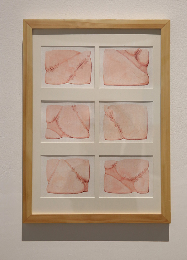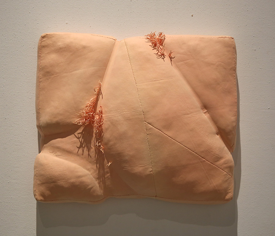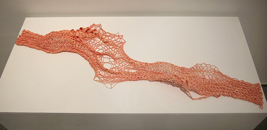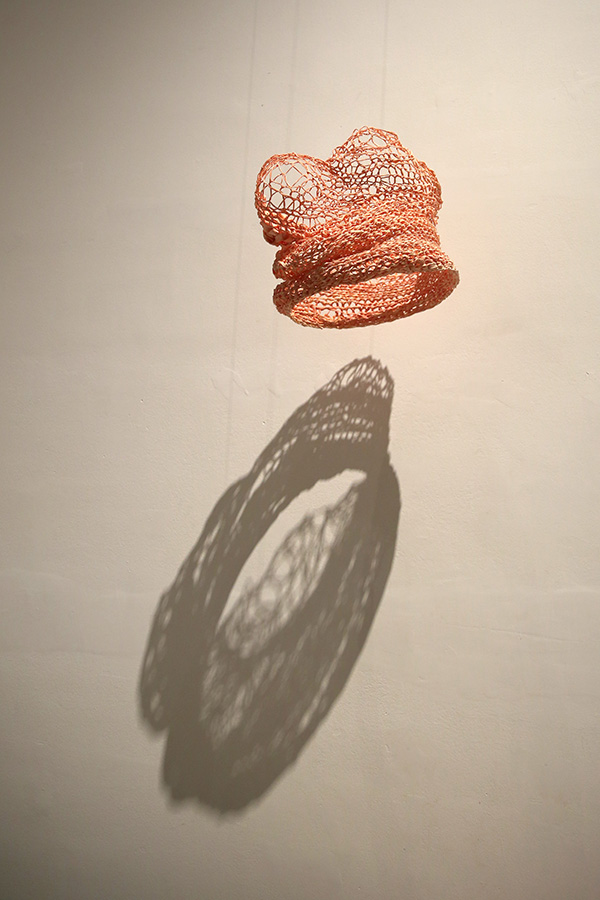 作品材料是我寻找和实验多次后发掘的合成巾, 它的特点是湿润时极其柔软,干燥后硬挺固型。 我将其染色裁剪,用传统方式钩织,使作品呈现出类似于皮肤细胞排列构造的规律。皮肤的状态,紧致又有松弛; 皮肤的节奏, 有疏密厚薄之变化。合成巾的特性使得制作的痕迹在干透之后定型,达到我想塑造的效果。