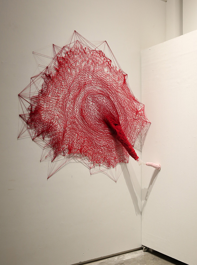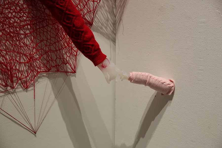可是啊,每个小天使降临这个世界时,都不是完美的,总有一些事情是无法达到父母的期待。无休止的争吵之后,孩子就会被认为是父母上辈子的冤家,被称谓为恶魔。父母都没有发现,此刻, 他们的无微不至的爱,悄悄的变成了一种可怕的压力与束缚,这种感觉要窒息似的,沉重的透不过气来…作品中,我将血红的像脐带一样的线,暗喻为孩子从父母身上血脉的继承与延伸,这根线编织成的温暖御寒的毛衣的同时,也束缚着孩子的成长。我想将爱与束缚这种无形的关系, 用有型的实物和视频的方式呈现,试图去探讨父母与孩子之间最恰当的相处界线。