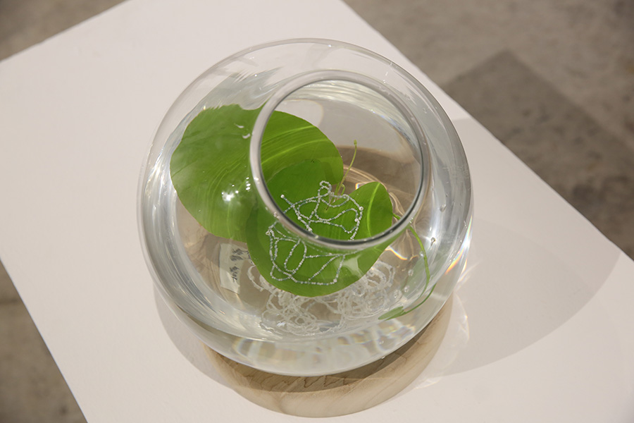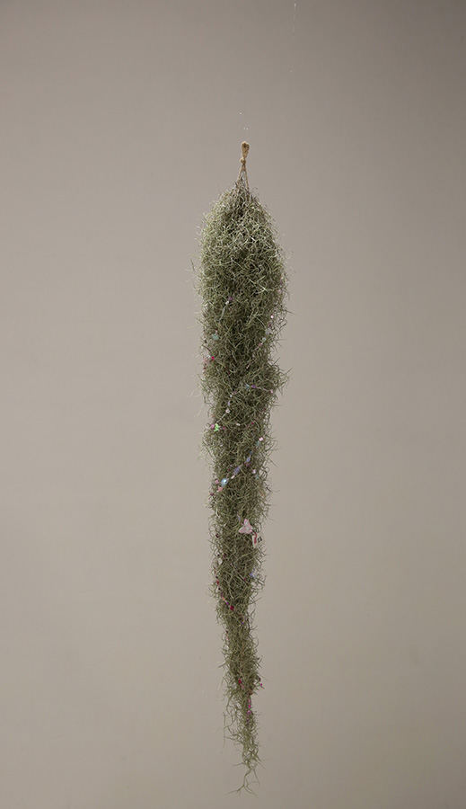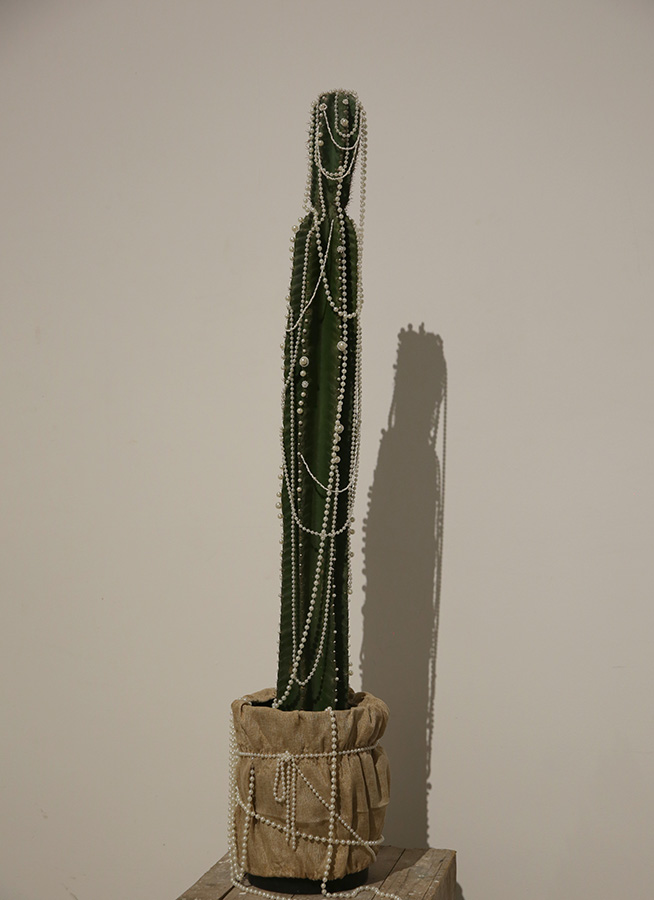 精致且细心的装饰,却是以伤害为基础的装扮与改造,在自然健康的生命上显得病态,且格格不入。 每一颗珠子在固定的同时便增添一点新的伤痕,而植物就在这不断受伤与愈合的过程中艰难生长,展现出分外顽强的生命力。我想,这与外界环境对我们自身的影响十分相似,迎合主流审美,压抑自己,伤害自己,再催眠自己。